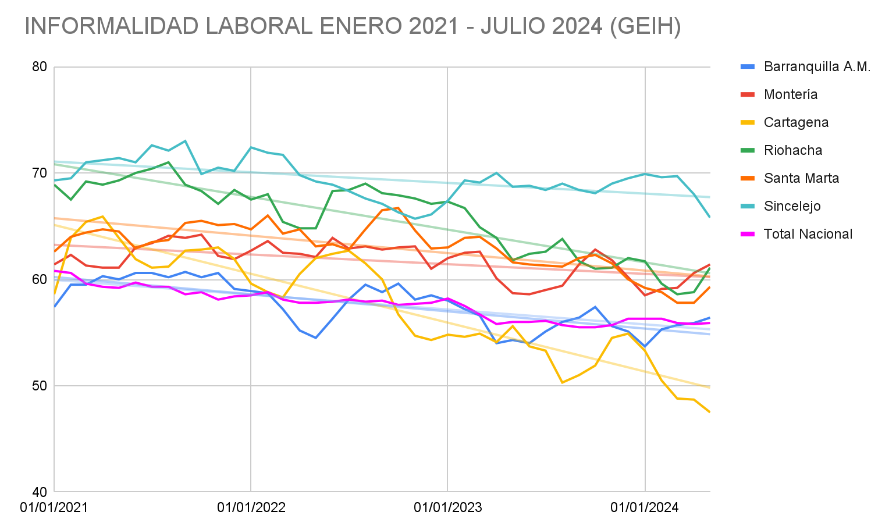 Teniendo en cuenta lo anteriormente mencionado, según las cifras del DANE, para el total nacional, en el trimestre julio - septiembre 2024 la proporción de personas ocupadas informales fue 55,9%, siendo un 0,2% menos que el mismo periodo del año pasado. Tomando únicamente las 23 ciudades y áreas metropolitanas del país, la informalidad para este periodo fue 43,3%, siendo 0,3% más que el mismo periodo del año pasado, sin embargo, esta cifra que ha venido disminuyendo el periodo postpandemia, ya que desde 2021, la informalidad para las 23 ciudades y A.M. se encontraba en 48%, representando una disminución de 4.7%. En comparación con otras regiones del país, La Región Caribe presenta, en promedio, los índices más altos de informalidad laboral, lo que refleja la grave situación laboral de la región. De las 5 ciudades más informales del país, cuatro son de la región caribe, Sincelejo de primera con el 66,7%, Riohacha de segunda con 63,3%, Valledupar por detrás de Cúcuta A.M. de cuarta con 62,2% y Montería de quinta con 61,2%.