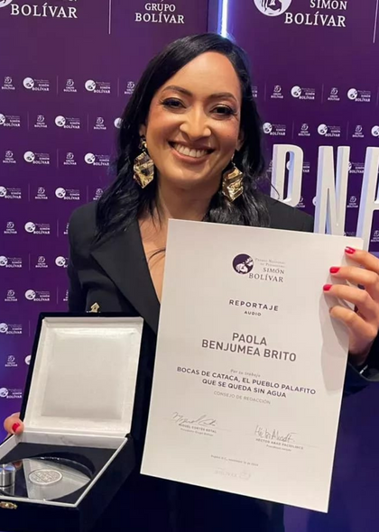 Paola Benjumea Brito, de 43 años, es egresada de la Especialización en Gobierno y Políticas Públicas de la Universidad del Norte (2018) y actualmente periodista del medio Colombiacheck. Con su proyecto de investigación ‘Bocas de Cataca, el pueblo palafito que se queda sin agua’ fue galardonada en la categoría de Reportaje en audio, debido a la reconstrucción minuciosa de los hechos, la capacidad interpretativa, la calidad de las fuentes, la verificación de la información y la variedad de recursos narrativos.