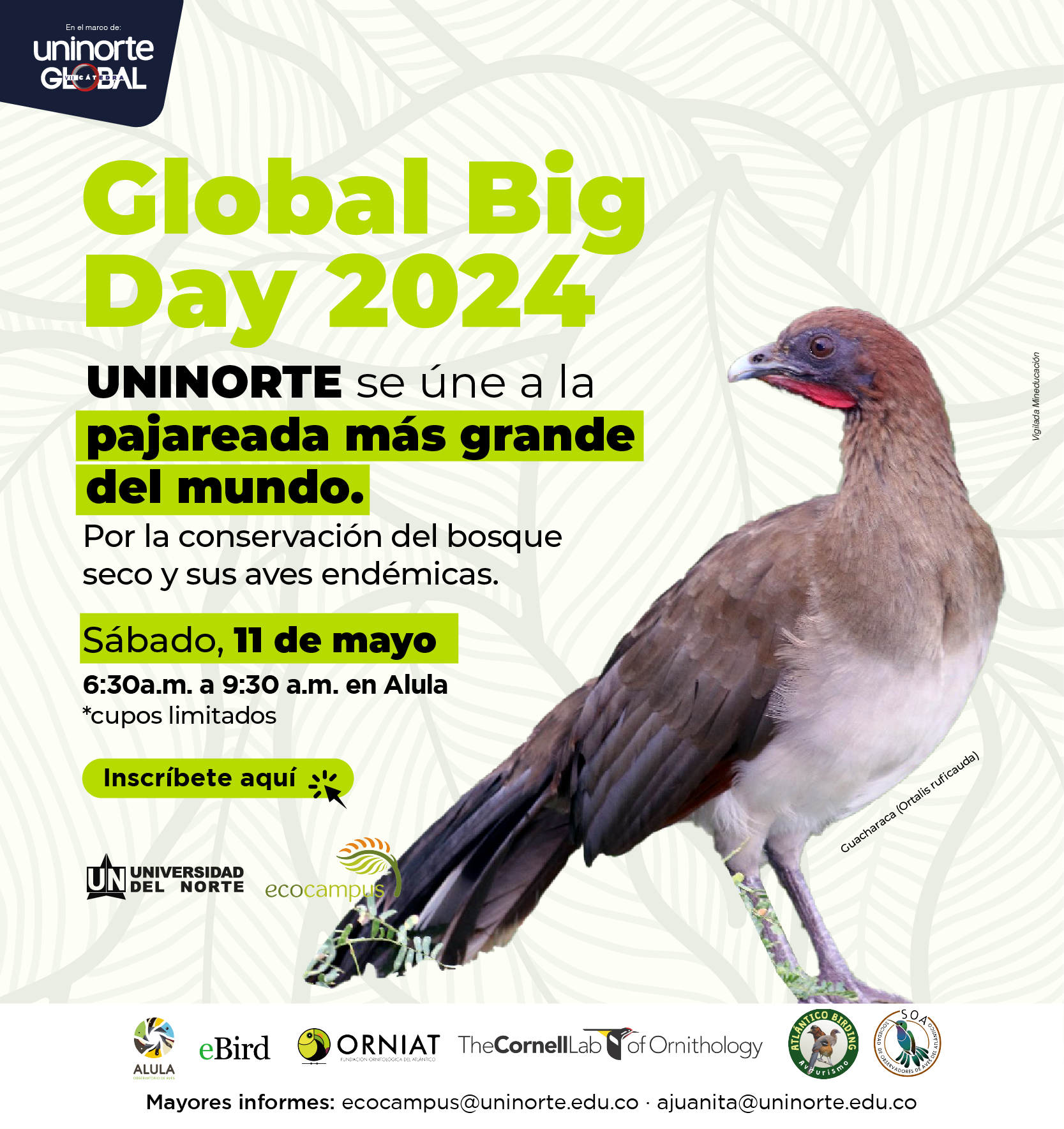 Cada mes de mayo, pajareros de todo el mundo nos damos cita para registrar el mayor número de aves durante un día; es un evento de ciencia ciudadana que nos invita al encuentro alrededor de la observación de las aves. Durante el Global Big Day cada especie de ave y sus individuos cuentan y este sábado 11 de mayo no será la excepción, es una oportunidad para conocer el bosque seco de Uninorte y registrar a las aves desde el observatorio de aves ALULA.