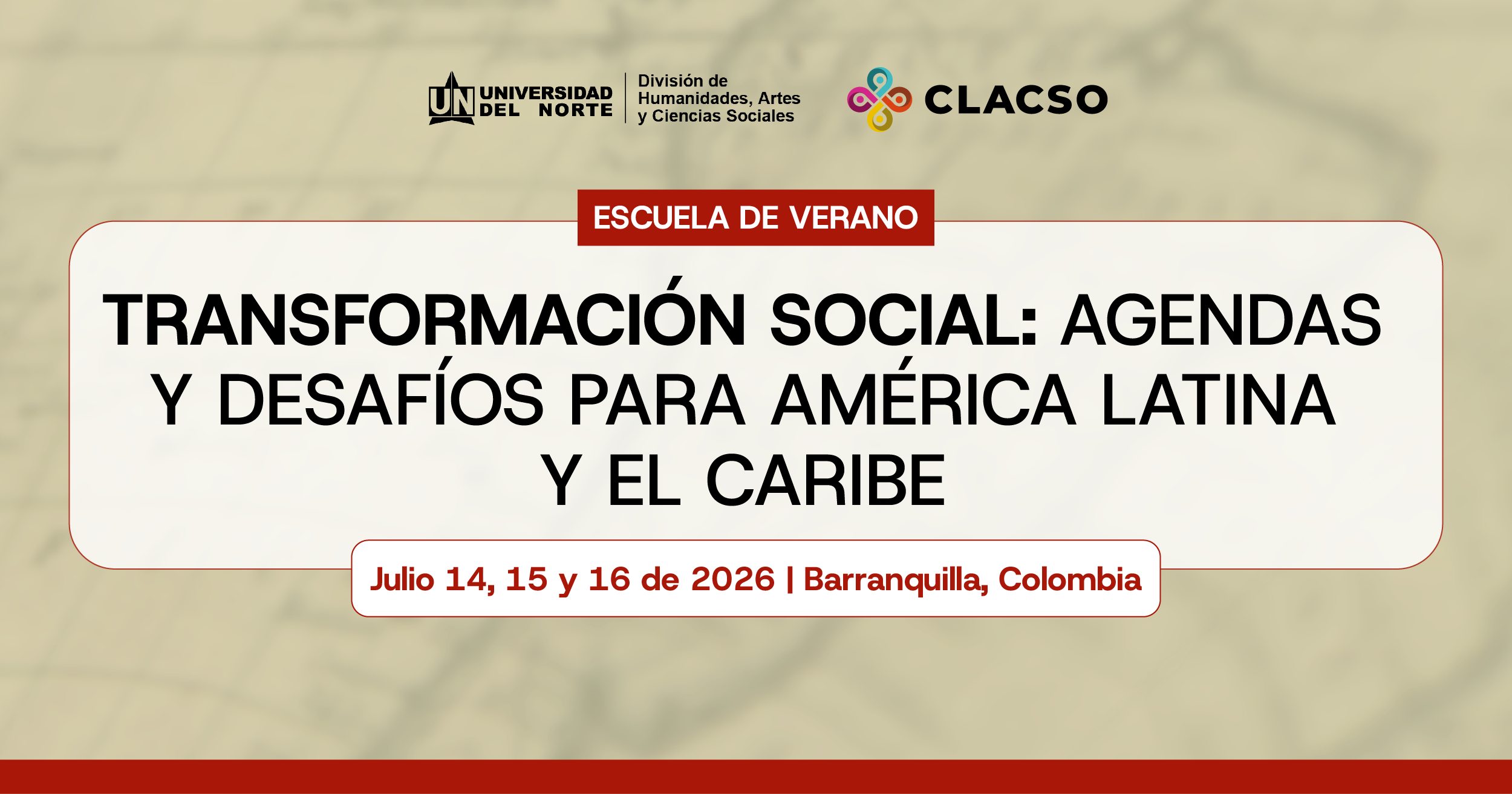 El Consejo Latinoamericano en Ciencias Sociales (CLACSO) y la División de Humanidades, Artes y Ciencias Sociales de la Universidad del Norte (DHCS / UNINORTE) convocan a investigadores/as, docentes, estudiantes de posgrado, activistas y profesionales vinculados a organizaciones sociales o políticas públicas en América Latina y el Caribe a postularse para participar en la Escuela Intensiva de Verano UNINORTE-CLACSO “Transformación Social: Agendas y Desafíos para América Latina y el Caribe”, que se realizará del 14 al 16 de julio de 2026 en Barranquilla, Colombia.