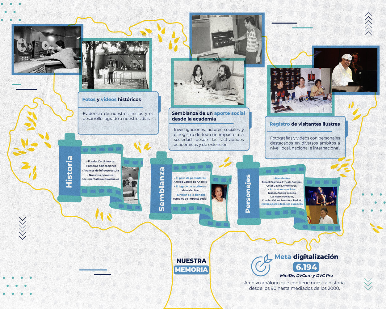 La experiencia ha derivado en la catalogación de 388 459 fotografías y más de 158 mil videos. El repositorio, ubicado físicamente en LACS, consta de fotografías impresas, diapositivas, negativos fotográficos y material en video en 7 formatos: ¾, Betacam, Betamax, VHS, Mini DV, DVC Pro y DV Cam. En estos registros se encuentra la evidencia de visitantes ilustres como presidentes y embajadores de Colombia y otros países, autoridades del orden local y regional, científicos destacados, artistas, líderes de opinión y de nuestros fundadores, quienes son actores de la historia y evolución de Uninorte.