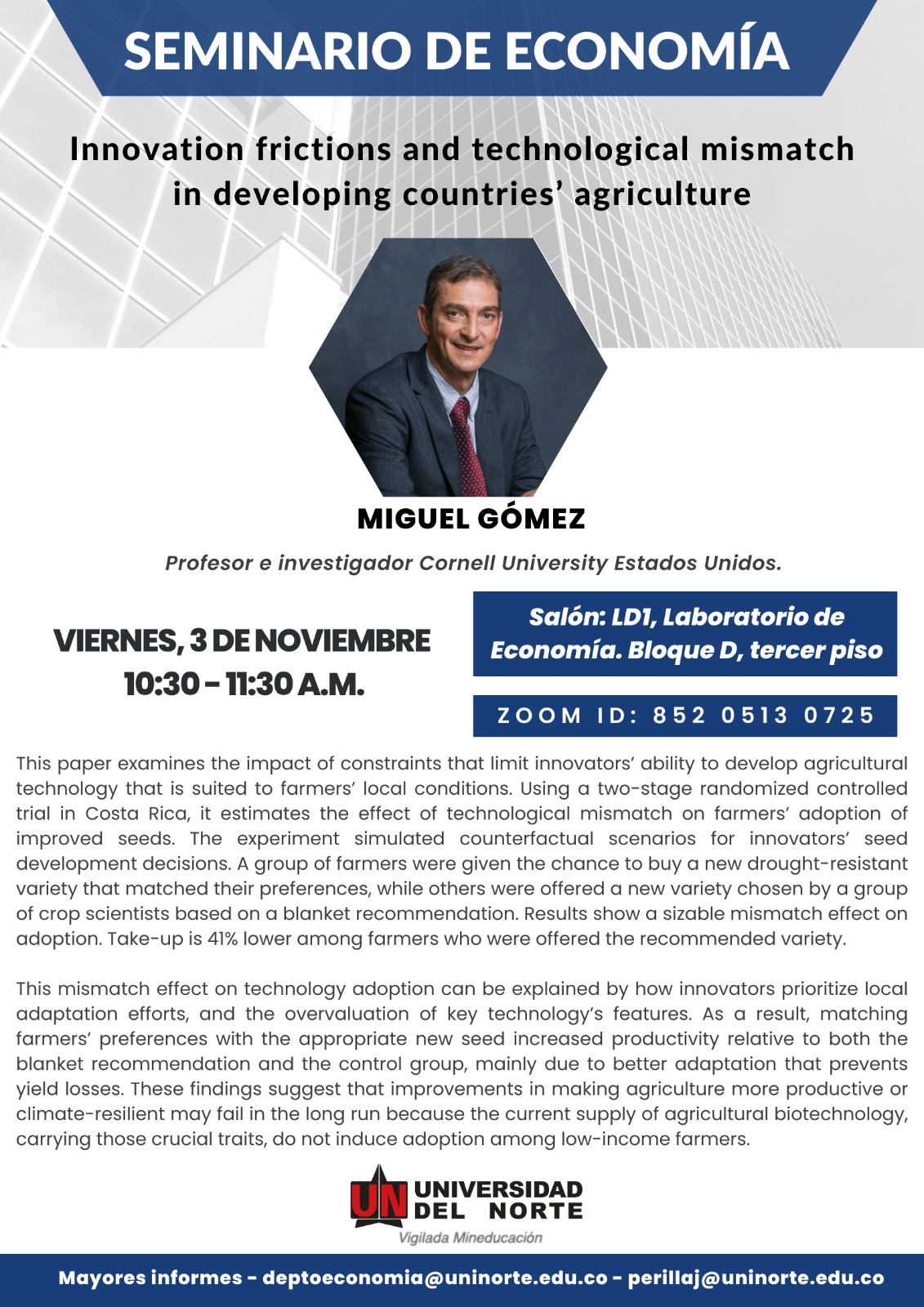 La Semana de Economía 2023 es un evento organizado por el departamento de Economía de la Universidad del Norte que tiene como objetivo difundir el conocimiento económico y social de la región Caribe y el país, así como promover el intercambio académico entre estudiantes, profesores e investigadores.