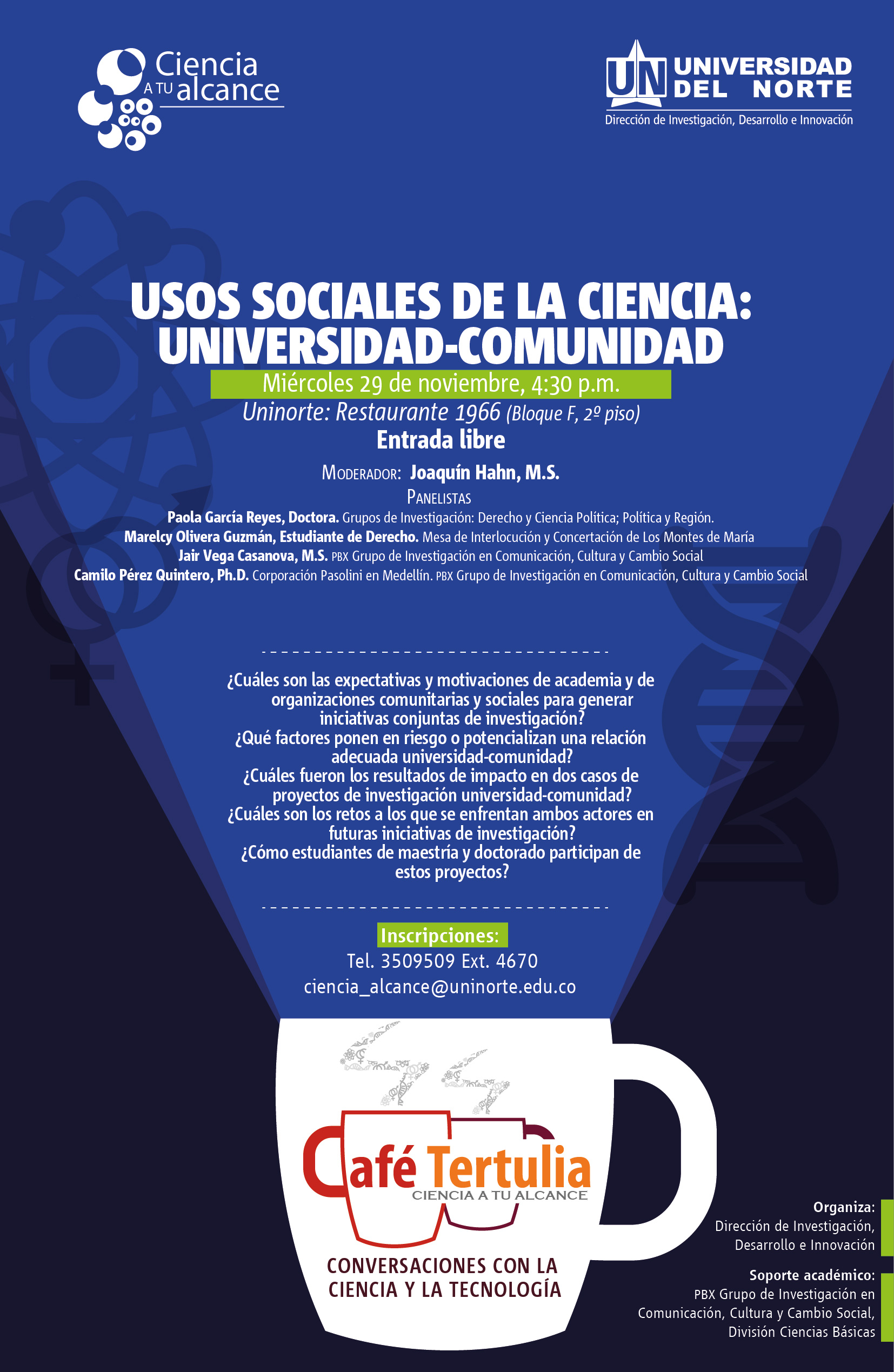 El Café Tertulia Ciencia a tu alcance cerró la serie “Usos sociales de la ciencia” con una entrega dedicada a la relación universidad-comunidad. El miércoles 29 de noviembre de 2017, académicos y representantes de organizaciones comunitarias y sociales conversaron sobre la dinámica y retos del conocimiento científico que estos actores desarrollan de manera colaborativa. En esta entrega se presentaron, a manera de ejemplos, dos proyectos de investigación en esta modalidad de relacionamiento: