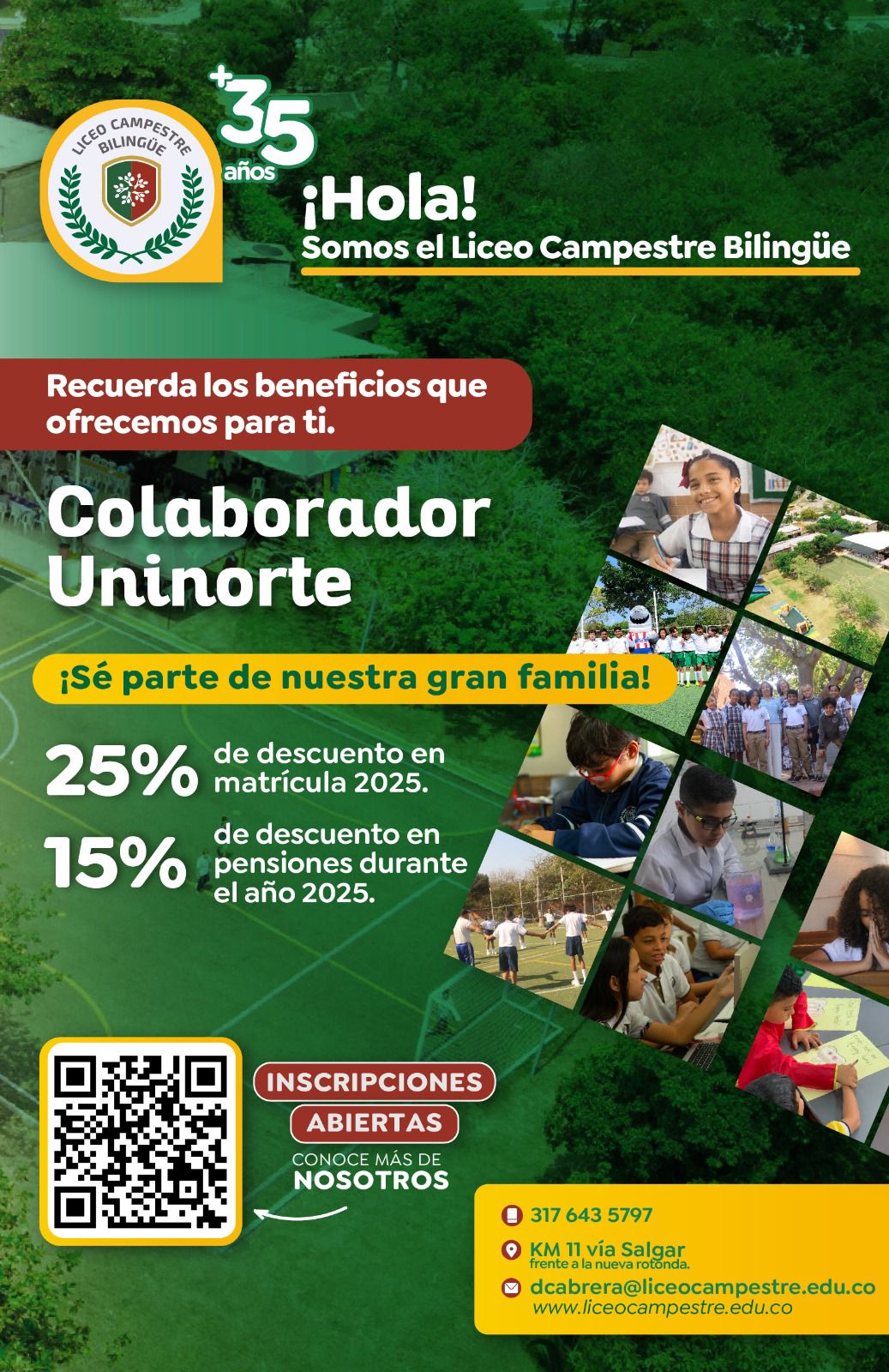 Ofrece descuentos a los hijos de los colaboradores (administrativos, docentes de planta, catedráticos) y pensionados carnetizados de LA UNIVERSIDAD, en las matrículas del Colegio LICEO CAMPESTRE.