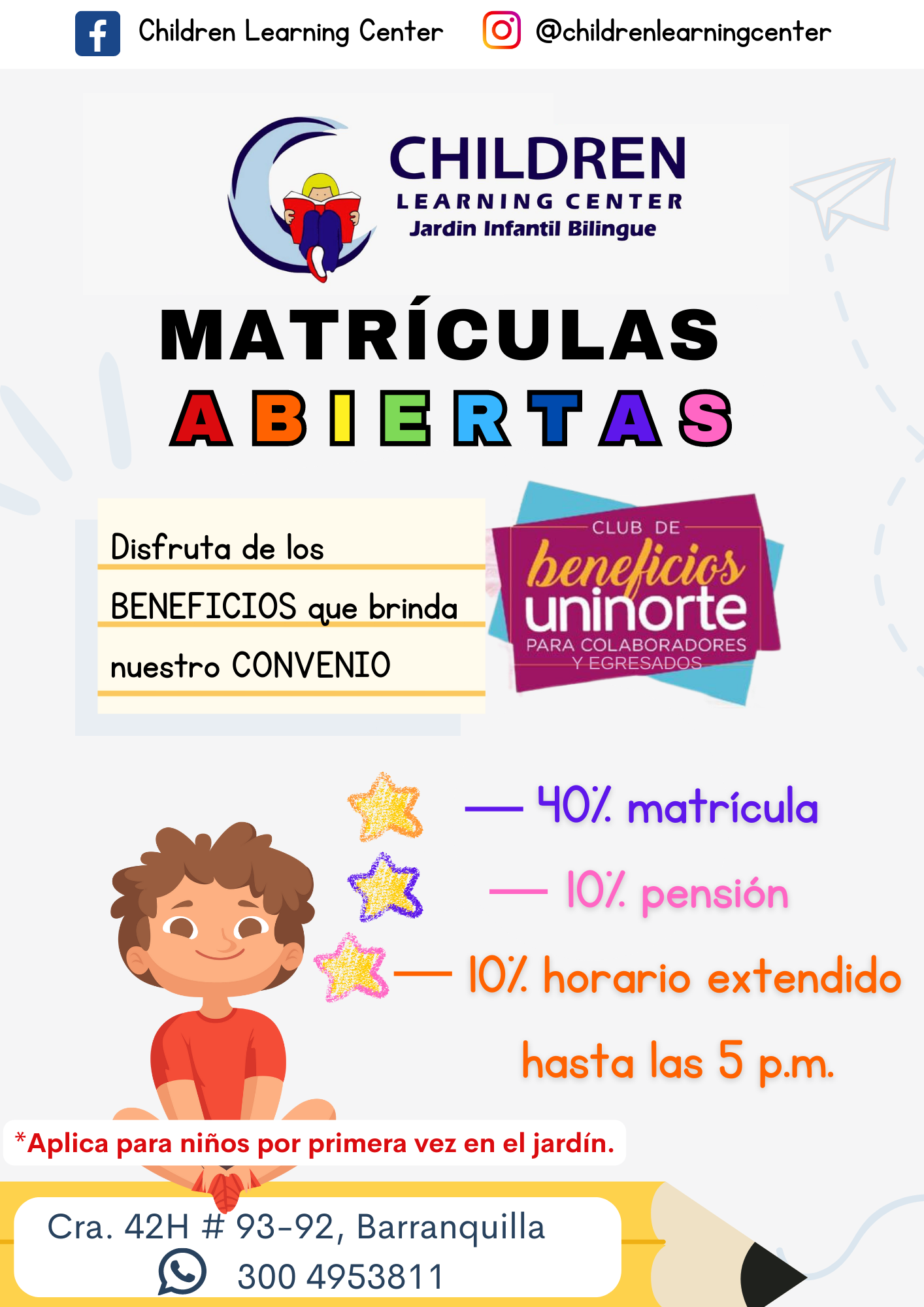 Le brinda el 40 % sobre matrícula y el 10 % sobre pensión, sólo aplica para niños nuevos en el jardín (una sola vez) y 10 % en horario extendió hasta las 5 PM (siempre y cuando esté abierto esta jornada )