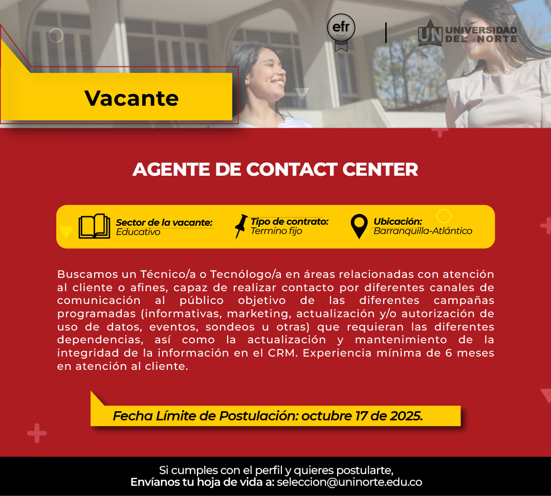 Buscamos un Técnico/a o Tecnólogo/a en áreas relacionadas con atención al cliente o afines, capaz de realizar contacto por diferentes canales de comunicación. Conoce mas de la vacante aquí.