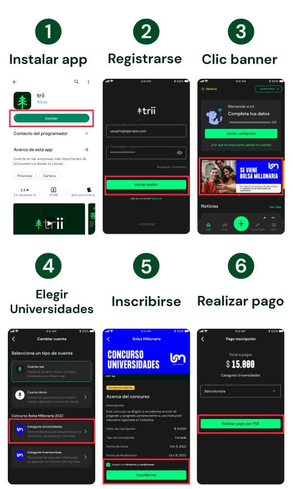 Descarga la app trii, elige cuenta real en la parte superior derecha, elige Bolsa Millonaria y paga por Pse. Costo de la inscripción $30.000 (por esta semana estará a $15.000 para que aprovechen).