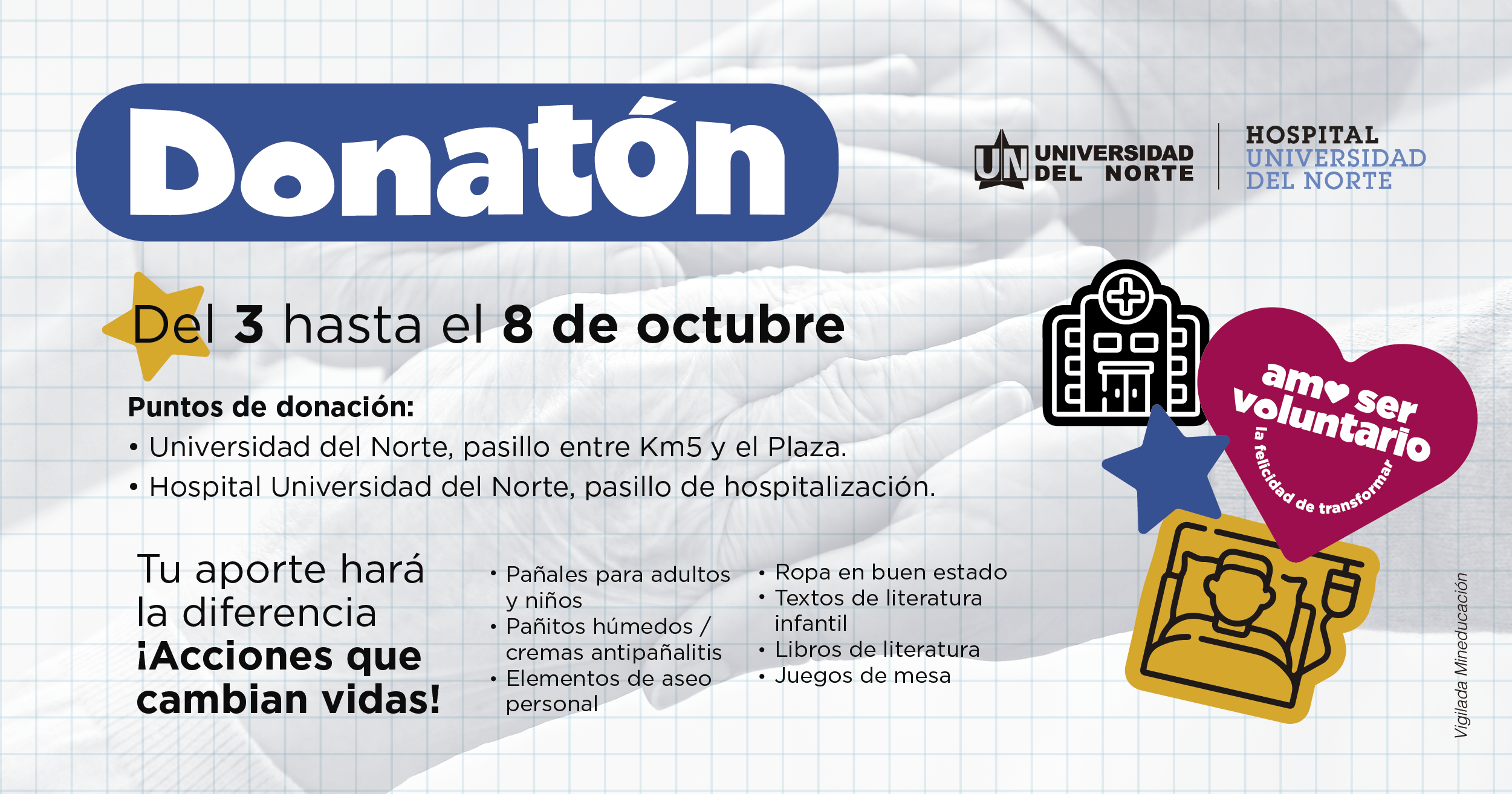 Esta es una iniciativa de donaciones que busca recolectar suplementos básicos para los pacientes del hospital que no tienen suficientes recursos para cubrirlos durante su instancia en el Hospital Universidad del Norte. El objetivo de esta jornada es el cambiar vidas desde el aporte de...