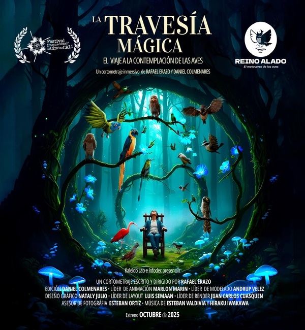 El proyecto El Reino Alado, la innovadora narrativa transmedia que une arte, ciencia y tecnología para promover el conocimiento y la conservación de las aves colombianas, continúa su expansión audiovisual tras estrenar el cortometraje La Travesía Mágica en el XVII Festival Internacional de Cine de Cali, realizado del 21 al 26 de octubre. La producción forma parte de las 14 experiencias digitales que conforman este metaverso de aves en desarrollo, y cuenta con la participación de estudiantes del programa de Diseño Industrial y de Negocios Internacionales de la Universidad del Norte.