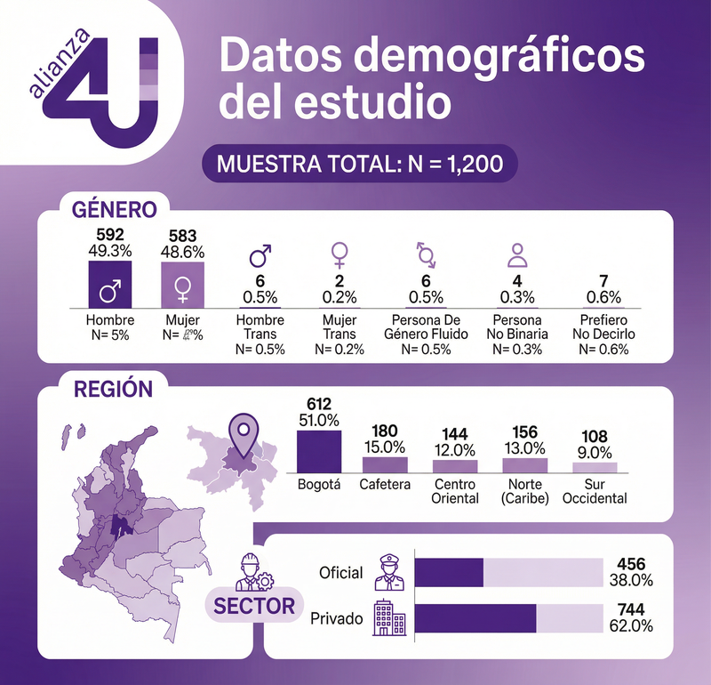 El levantamiento de información se realizó entre abril y junio de 2025, y reunió a 1200 estudiantes entre 18 y 28 años, provenientes de 122 instituciones en 23 departamentos y 35 municipios. La amplitud y selección estratificada de la muestra permite observar el fenómeno con una perspectiva nacional y comparativa, en un contexto donde la última medición oficial data de 2015.