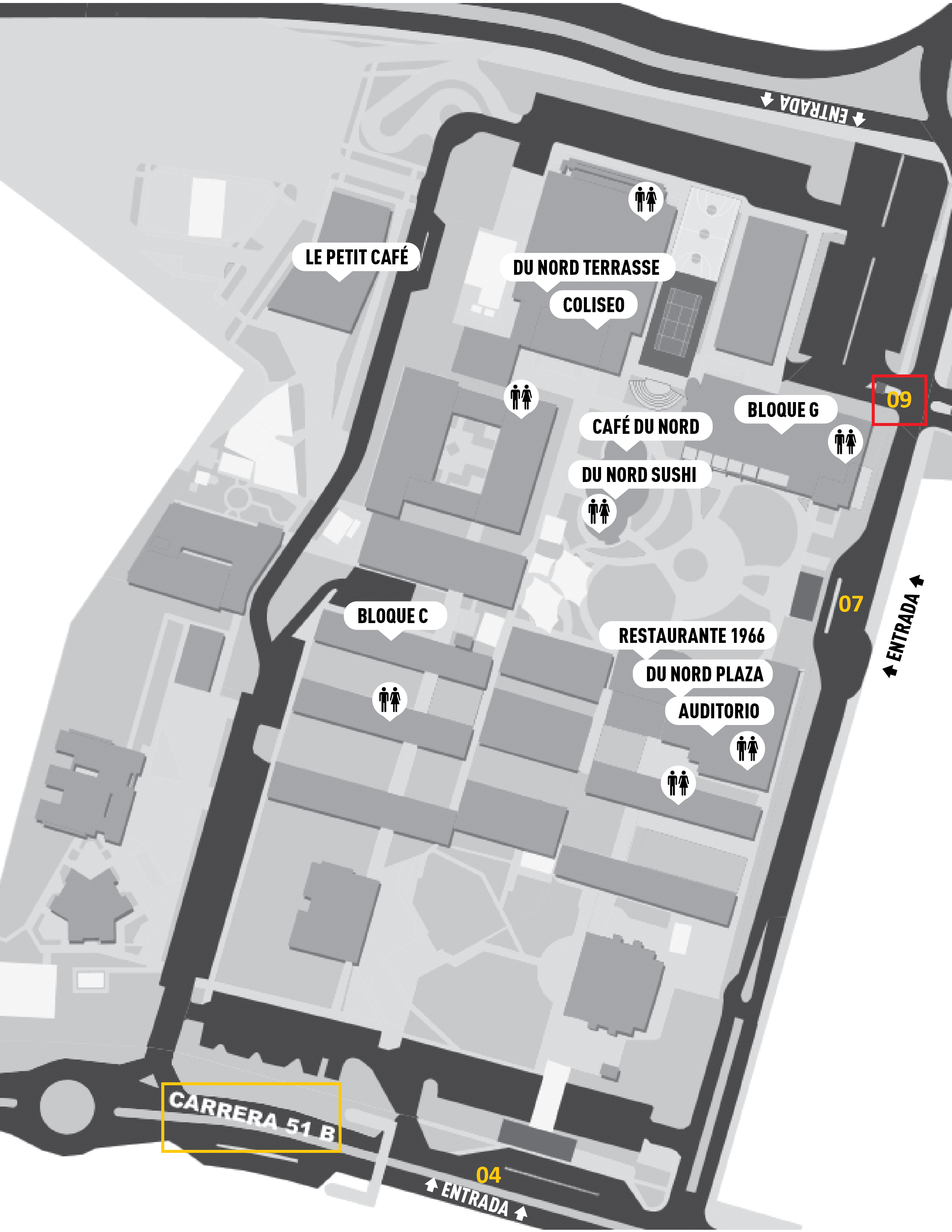 Puerta de acceso a la Universidad: los participantes podrán entrar a la Universidad por la puerta de acceso exclusiva ubicada en el interior del parqueadero 9. Mapa